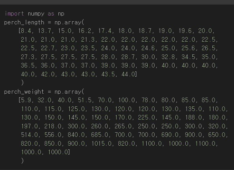 넘파이 불러와주고 농어 길이랑 무게 데이터를 가져와준다