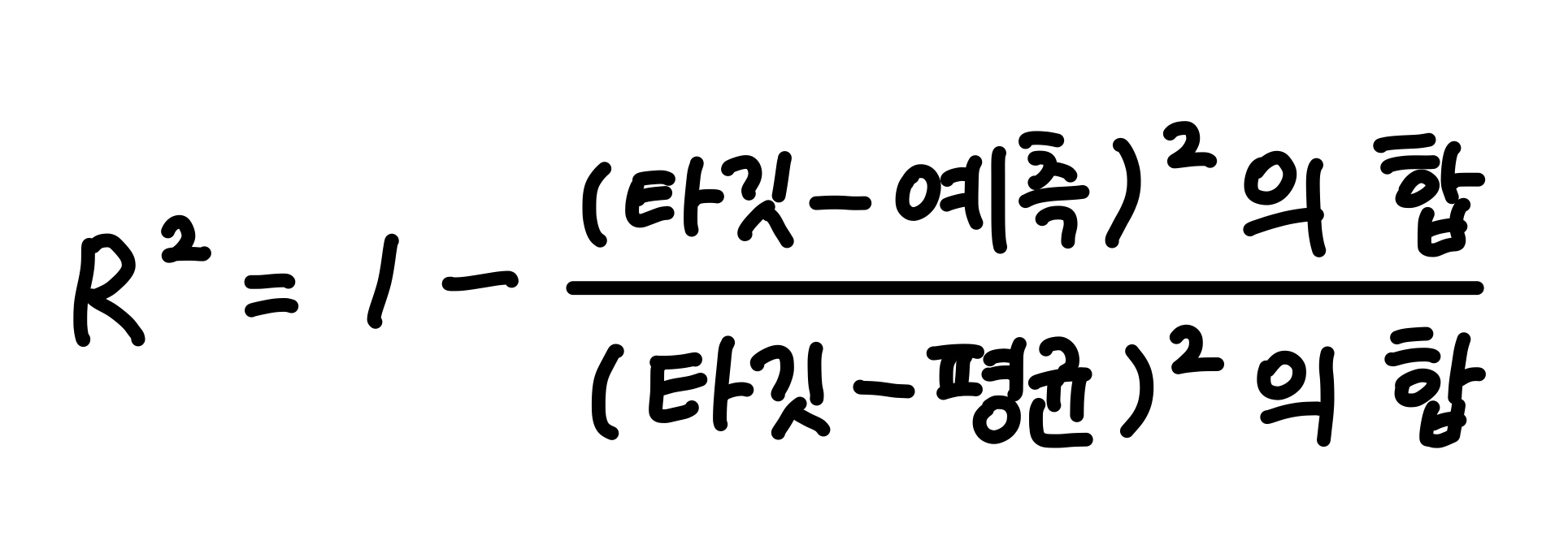 결정계수는 각 샘플의 타깃과 예측값의 차이를 제곱하여 더하고 타깃과 타깃 평균의 차이를 제곱하여 더한 값으로 나눠준 값이다