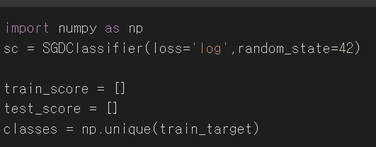 확률적 경사 하강법에서 훈련세트를 한 번 모두 사용하는 과정을 에포크라고 한다