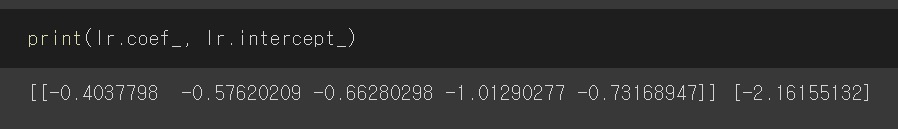 이제 로지스틱 회귀 모델이 학습한 계수와 선형 방정식을 확인해보겠다