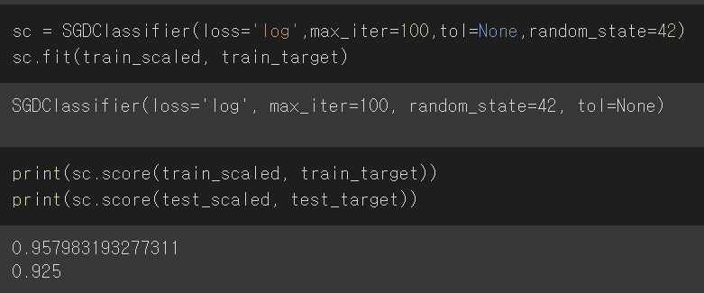 max_iter를 100으로 한 뒤 훈련시켰을 때 각 세트에서의 정확도 점수가 높은 수준으로 나온 것을 확인할 수 있다