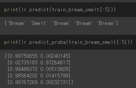 훈련한 모델을 사용해 train_bream_smelt에 있는 앞 5개 샘플을 예측해본다