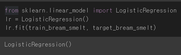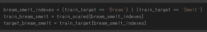 이를 통해 불리언 인덱싱(넘파이에서 True, False 값으로 행 선택)으로 train_scaled와 train_target에 도미와 빙어 데이터만 넣는다