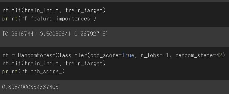이때 부트스트랩 샘플에 포함되지 않는 샘플을 OOB 샘플이라고 하는데, 이 샘플을 사용해 부트스트랩 샘플로 훈련한 결과를 평가할 수 있다