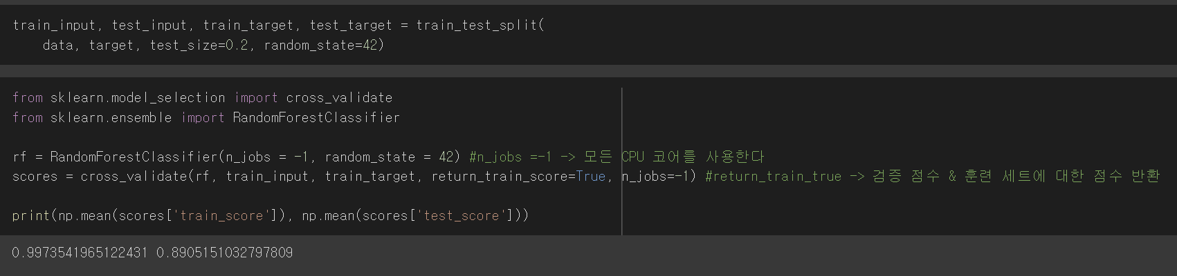 cross_validate()의 return_train_score를 True로 지정하면 검증 점수와 훈련 세트에 대한 점수를 모두 반환한다 (디폴트는 False)
