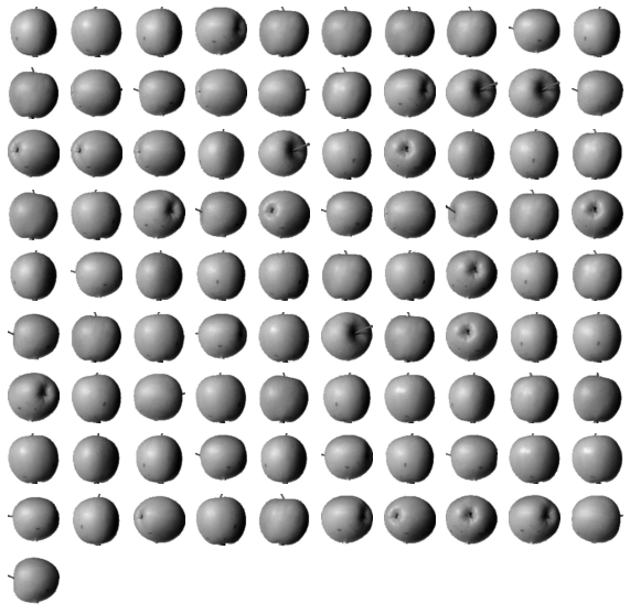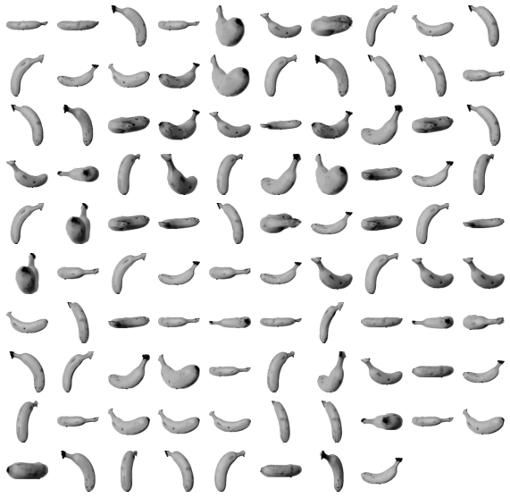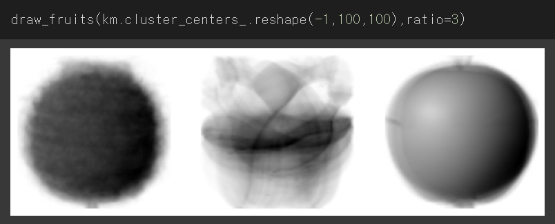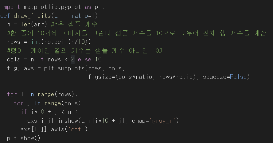 각 클러스터가 어떤 이미지를 가지고 있는지를 확인하기 위한 함수를 만들어준다draw_fruits()는 (샘플 개수, 너비, 높이)의 3차원 배열을 입력값으로 받아 가로로 10개씩 이미지를 출력하는 함수이다figsize는 ratio 매개변수에 따라 커지는데, 기본값은 1이다