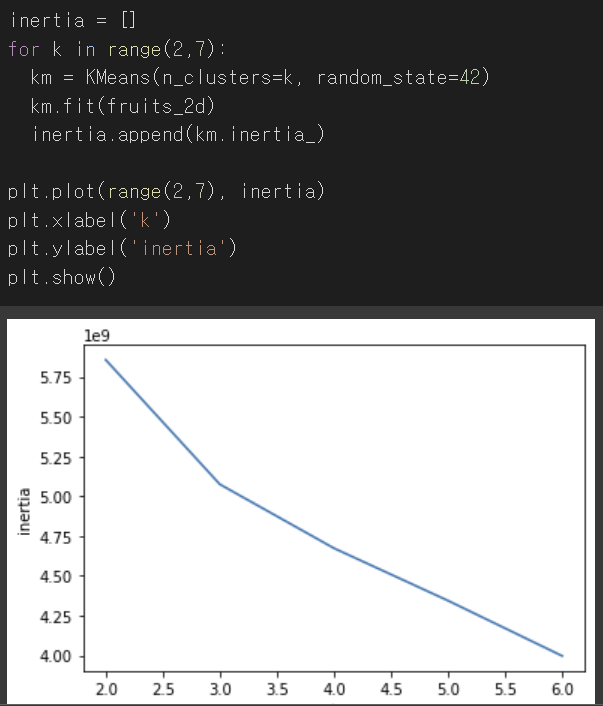 k평균 알고리즘은 클러스터에 속한 샘플 사이의 거리를 잴 수 있는데, 이 거리의 제곱 합을 이너셔(inertia)라고 부른다이너셔는 클러스터에 속한 샘플이 얼마나 가까이 모여 있는가를 나타내는 값으로도 볼 수 있다클러스터 개수가 늘어나면 클러스터 개개의 크기가 줄어들게 되므로 이너셔도 줄어든다