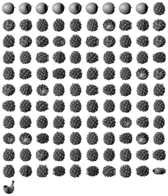 그리고 각 클러스터별로 샘플 이미지들을 출력한다여기서는 레이블 0, 레이블 1, 레이블 2에 각각 파인애플, 사과, 바나나가 각각 포함되어 있었다레이블0의 경우 파인애플이 대부분이었지만 바나나와 사과가 섞여있었다