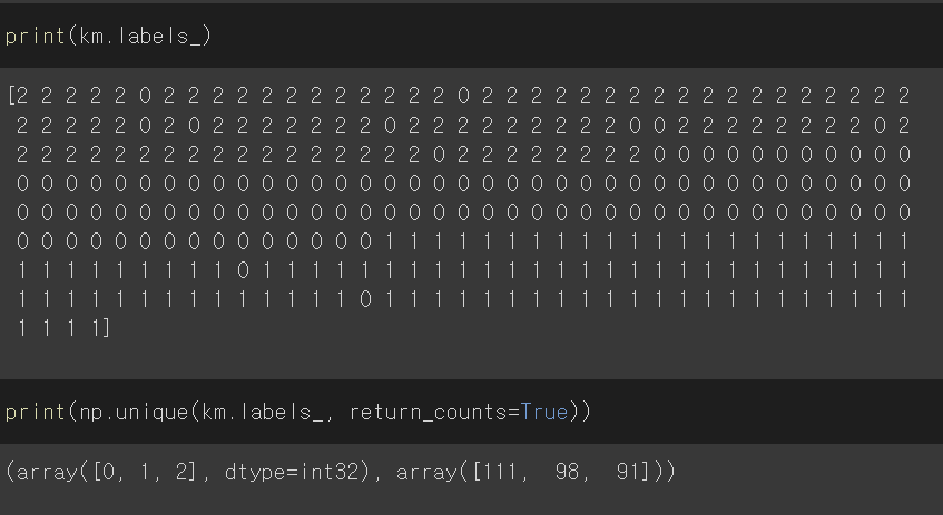 샘플들을 확인해보면 n_clusters를 3으로 했기 때문에 0,1,2로 되어있는 것을 확인할 수 있다